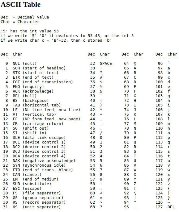 Char 代表文字符號, Dec 代表相對應的十進位數字